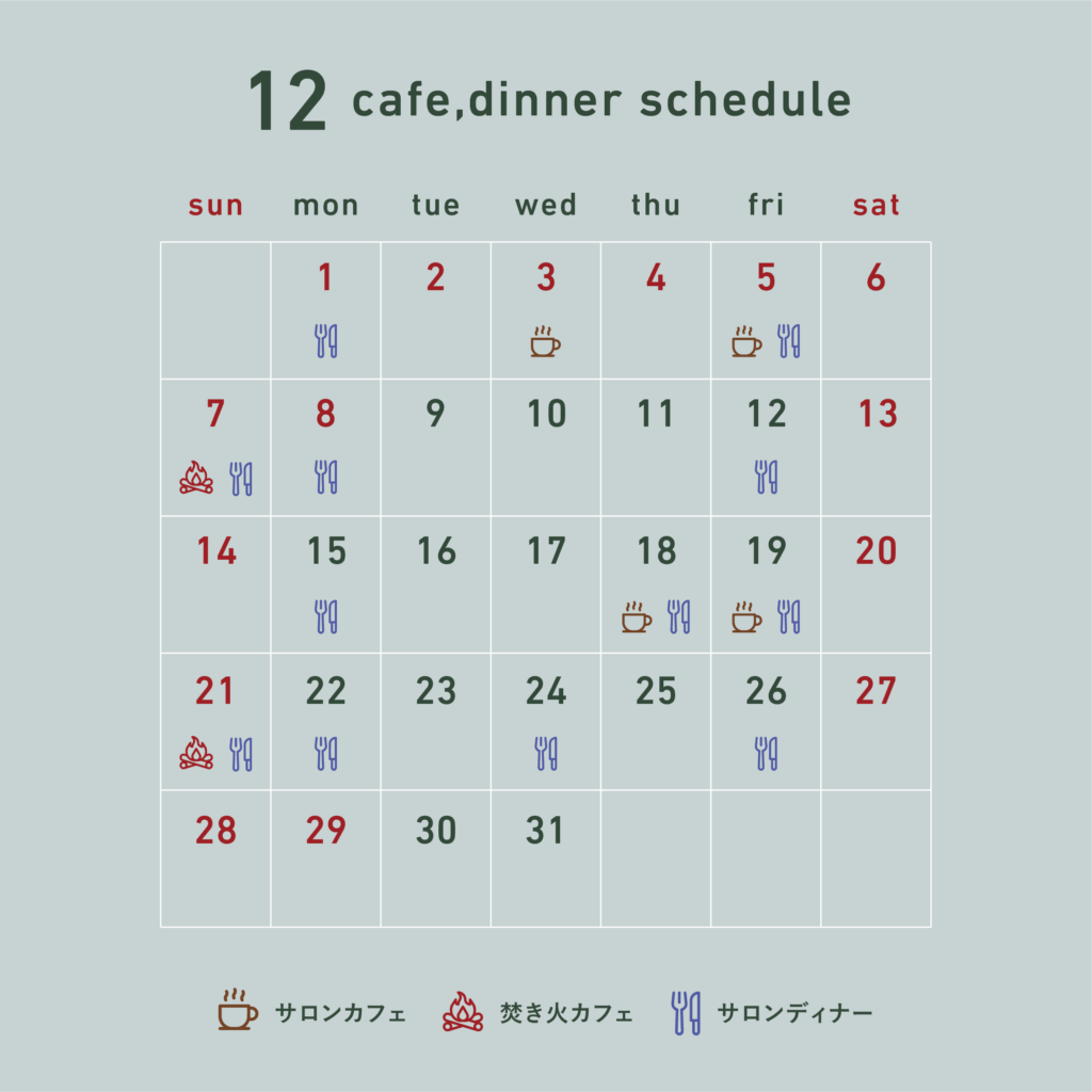カフェとディナーの営業日は、毎月末日を目処に、翌月1ヶ月分のスケジュールを決定、公開しております。