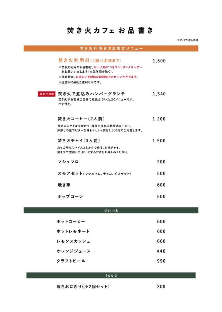 • 焚き火をご利用の方は、「焚き火利用料 1,500円」(4名さままで)を頂戴いたします。
